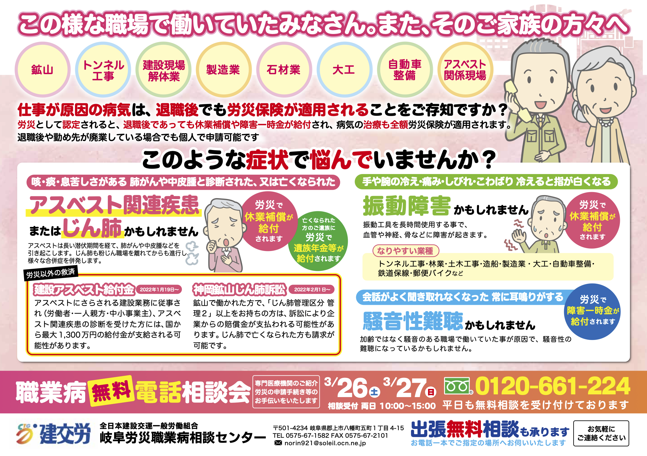 今年はコロナの影響により相談会を開催できない状況ですが電話相談も事務所の営業時間はいつでも受けつけております。自分、または周りの方が振動病・じん肺・難聴でお悩みの場合がございましたらご連絡ください。